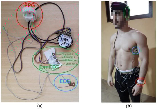 For the acquisition of the signals studied, a novel monitoring system was developed consisting of different sensors capable of synchronously recording at 250 Hz the electrocardiogram (ECG), photoplethysmogram (PPG) and 3 electroencephalogram (EEG) channels of the ear and storing them for further processing and analysis on a microSD card. Such a system has been extensively described in [29]. This device provides information on health status through the calculation of heart rate variability (HRV), pulse travel time (PTT) and certain characteristics of the ear EEG signal. It has been designed in such a way that it can be used in static and/or ambulatory mode. It has also been validated and compared with other commercial systems with similar results. Figure 2a shows the different components of the monitoring system. On the other hand, Figure 2b shows the final arrangement of the system on a user.