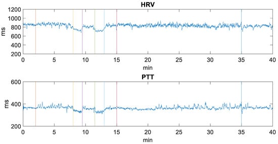 Variation in milliseconds of a volunteer’s HRV and PTT values throughout the experimental procedure (40 min). The vertical-colored lines separate the periods of the different activities developed during the experimentation carried out in a clinical setting with people with epilepsy.