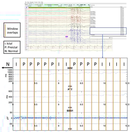 The normalized data are stored in a spreadsheet for each volunteer. Each entry (window) will be made up of 93 columns (extracted characteristics) and an end column of each window. The purpose of this last column is to be able to know the time instant of each window and to be able to add another extra column, called label, which will indicate according to the diagnosis provided by the neurology team the classification of the epileptic person’s state (N-Normal; P-preictal; I-Ictal). It is noteworthy that the 5 windows (∿1 min) before the onset of an ictal state were classified as preictal as long as no other ictal state appeared [44]. A normal state follows an ictal state unless ictal patterns continue to appear. A preictal state will never appear before a normal state, since the ictal state represents the moments before a seizure. Figure 5 shows an example of how the process of classifying status epilepticus was carried out based on the information provided by the medical team. Once all the labels have been placed, the end column of each window is deleted as it does not provide any information to the predictive models. To make the dataset, all entries from all patients’ spreadsheets are finally pooled and randomly shuffled with the aim of having a heterogeneous distribution of data. In total, the dataset consists of 2153 entries and 94 columns (extracted features and status classification label). Within the 2153 entries: 392 are labelled as I; 505 labelled as P and 1256 labelled as N;