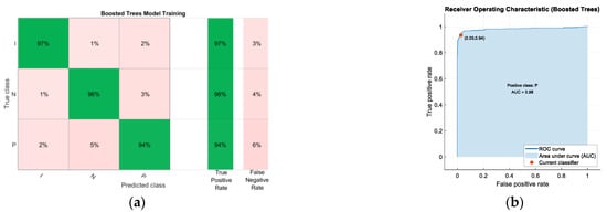 (a) Confusion matrix of the Boosted Trees model after training; (b) Receiver Operating Characteristic (ROC) curve and its respective Area Under Curve (AUC).