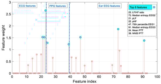 To assess the importance of the features chosen in the model and to analyze which are the input variables to which the model gives the highest feature weight in the prediction algorithm, the Neighborhood Component Algorithm (NCA) has been used [49]. Figure 8 shows a plot of the feature weights for each of the 93 predictors. In this figure, the 8 predictors with the highest weights (LF/HF ratio, Median entropy EEG2 (EEG channel 2), pLF, pHF, 75th percentile EEG1 (EEG channel 1), Median entropy EEG3 (EEG channel 3), Mean PTT, NN50 PTT) are highlighted. In a system where further optimization is required, the variables that contribute least to the prediction could be excluded, allowing the model to be lightened.