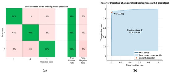 (a) Confusion matrix of the Boosted Trees model after training using the 8 predictors with the highest weights after applying the NCA algorithm; (b) Receiver Operating Characteristic (ROC) curve and its respective area under the curve (AUC).