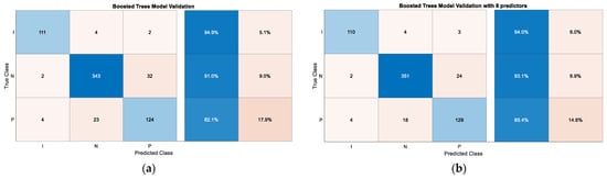 (a) Confusion matrix of the Boosted Trees model after validation; (b) Confusion matrix of the Boosted Trees model with 8 predictors after validation.