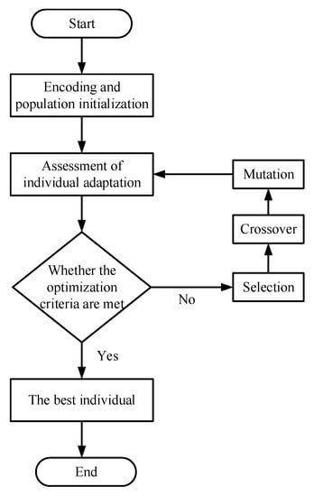 The genetic algorithm is an optimization algorithm that simulates the natural selection and genetic evolution of organisms [17,18,19]. It usually includes three genetic operators: selection, crossover and mutation. The genetic algorithm is an iterative process; each cycle is a generation. In the operation, the inheritance is terminated after a specified number of generations, and then, the optimal chromosome is found among all generations. The genetic algorithm optimization is performed again if the optimal solution is not found. When using the genetic algorithm to solve the optimization problem, it mainly needs to go through six steps: encoding, initial population generation, fitness value evaluation, selection, crossover, and mutation, so that the population evolves into a new generation of a better adaptive population. The specific process of the genetic algorithm is shown in Figure 1.
