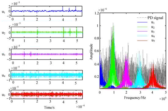 Figure 5 shows the decomposed eigenmodal components and their corresponding spectra when K is taken as 5. It can be seen that the peak of the spectrum of mode u2 coincides with the peak of the spectrum of the noise-containing signal, and the peak of the spectrum of mode u3 coincides with the peak of the noise-containing signal near 2 MHz. This shows that the VMD decomposition of the noise-bearing signal is the best at this time.