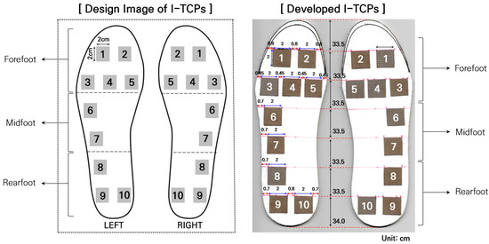 The I-TCPs presented in this study are a modified version of our previously developed insole sensor [24]. For I-TCP, a textile pressure sensor (W-290-PCN) with a size of 3 × 3 cm was used, and its thickness was 1 cm. To test sensor performance, compressive pressure variations from 0 to 110 kPa [25] and repetitions of 5000 times with a force of 450 kPa were used [8]. Based on the findings from our previous studies, 5 capacitive sensors were placed in the forefoot area, 2 in the lateral midfoot, and 3 in the rearfoot area for more accurate detection of PP during dynamic gait (Figure 1). In normal locomotion, the heel, metatarsals, and phalanges support most of the body weight and adjust the body balance [26]. These anatomical structures function as the medium to absorb and deliver the contact force derived from the foot during gait in the form of ascending neurophysiological information [27]. To capture the characteristic plantar pressure during gait, a total of 10 capacitive sensors in an insole were placed over the most representative anatomical locations of the walking foot [17,24].