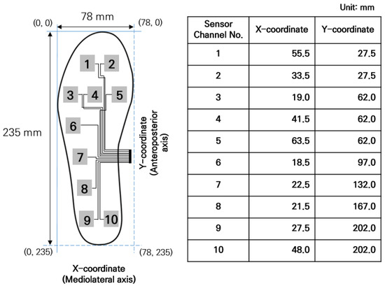 In order to extract COP data collected from I-TCPs, x-coordinates (mediolateral shifting of COP) and y-coordinates (anteroposterior shifting of COP) for each sensor were specified and calculated as shown below in Figure 4 [19]. Figure 4 presents the detailed coordinate information for each sensor channel of female I-TCPs in a 235 mm insole with 78 mm width.