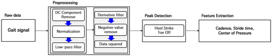 For analysis of the collected gait signals, data processing was performed in the order shown below in Figure 5. First, preprocessing was performed, and then Heel Strike (HS) and Toe Off (TO) indicators were extracted. Then, the gait index was calculated based on HS and TO. All signal processing and analysis were performed by MATLAB R2021a.