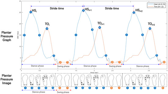 As shown below in Figure 6, HS and TO were extracted from I-TCPs data. As HS refers to the initial heel contact at the beginning of each gait cycle, the blue line graph in Figure 6 shows the changes in peak PP collected from the heel area of the insole (peak average of ch. 9 and ch. 10). The orange line graph shows the changes in peak PP in the toe area (peak average of ch. 1 and ch. 2). Based on every heel strike, stride time was calculated for each gait cycle (Equation (1)). According to the PP data detected in the forefoot, midfoot, and heel areas, the stance phase and swing phase were defined (Figure 6).