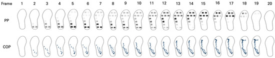 For COP analysis, the x-coordinate (mediolateral shift) and y-coordinate (anteroposterior shift) values were calculated by Equations (3) and (4) based on the PP data collected by I-TCPs. The x-coordinate and y-coordinate were calculated using the coordinate information from the insole sensor (Figure 4). The direction of COP(x,y) was used for COP trajectory analysis. Figure 7 below shows the process of COP extraction based on PP obtained from I-TCPs. An average of five samples was defined as one frame, which makes 100 data points per second (100 Hz), displaying 20 frames per second: