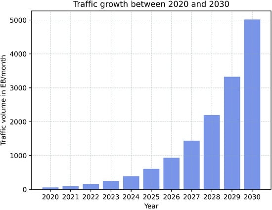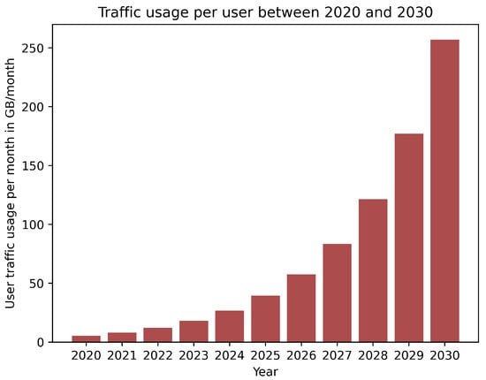 Predicted user data traffic per month according to the ITU-R Report M.2370-0 from 2020 to 2030.