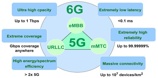 Moving toward a fully connected society, in conjunction with the rapid development of emerging applications such as the Internet of Everything (IoE), Industry 4.0, virtual reality (VR), and 8K video streaming, has resulted in unexpected traffic volume over telecommunication networks. According to the ITU-R Report M.2370-0, mobile data traffic is expected to be higher than 5036 EB per month in 2030, as shown in Figure 1, while the user mobile data usage will rise from 5 GB in 2020 to more than 250 GB per month in 2030 as in Figure 2 [1]. To handle that massive amount of traffic, industry and academia are working day and night to develop new generations of mobile communication systems. Recently, the fifth generation (5G) has been gradually deployed for commercial use across various markets [2]. The 5G network is eager to provide a fully connected society and has three main use cases: enhanced mobile broadband (eMBB), massive machine-type communications (mMTC), and ultra-reliable low-latency communications (URLLC) [2]. eMBB aims at providing high data rate communications and improving the performance of mobile networks in terms of capacity and coverage, which is crucial to provide mobile broadband connectivity to meet the massive value of data traffic. The other target is to assure a data rate of up to 20 Gbps in high-density populated areas. mMTC aims to provide the connection to a massive number of devices, such as Internet of Things (IoT) nodes, which leads to achieving the goal of a connected world. This requires shifting from serving traditional human clients in LTE systems to machine-to-machine (M2M) communications to support high bandwidth applications such as augmented/virtual reality (AR/VR) and streaming. Finally, URLLC indicates mission-critical applications (i.e., autonomous driving, vehicle-to-everything (V2X) communications, intelligent transportation systems (ITSs), and remote surgery), which require guaranteed connection and low latency. This implies that the communication link should always be available to transfer data in a short period and with high reliability [3]. However, as mobile network capacity and the number of connected devices increase, along with the introduction of new traffic patterns and service diversification, there will be a significant gap between 5G capabilities and market requirements expected after 2030. Therefore, research activities have been ongoing in order to specify requirements and identify potential radio technologies and architectures for the next big evolution in the telecommunications industry, known as 6G [3,4,5,6]. To this end, 6G is expected to provide extremely low latency connectivity, high peak data rate, high 3D coverage, significant capacity, and higher energy and spectral efficiency than 5G, as shown in Figure 3. Table 1 provides a comparison between 5G and 6G.