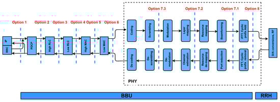 Nevertheless, the main drawback of 5G CRAN is the cost of the fronthaul. Furthermore, the fronthaul requires high-capacity and low-latency connections. For instance, a sector configured as 64 × 64 MIMO with 20 MHz bandwidth requires about 64 Gbps for fronthaul while guaranteeing a low latency connection equal to 100 s. For that, the 3rd generation partnership project (3GPP) has introduced several functional split options, as shown in Figure 5, which are initially identified as split points 1–8 between the BBU and the RRH in the CRAN architecture [15]. Option 8 represents a fully centralized RAN in which all baseband functions are centralized in a BBU pool, whereas option 1 denotes a traditional network architecture in which baseband functions are allocated at the cell site.