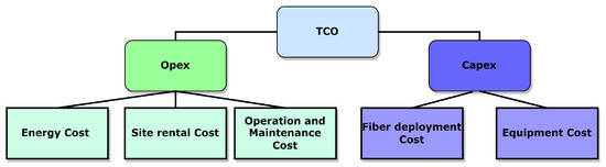 Figure 6 depicts the model used to calculate the TCO value, as well as a breakdown of the Capex and Opex costs. This framework for cost assessment is derived from the TCO model described in [25]. The Capex and Opex will be described in detail in the following section, with the objective function to minimize the TCO of the network.