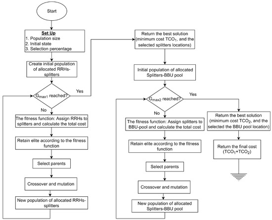 However, a traditional architecture for any telecommunication system consists of a number of base stations (BSs) as a medium connecting the end users to the core network. From 2G to 4G, the main deployment scenario was based on the distributed radio access network (DRAN). In DRAN, the baseband unit (BBU) and the remote radio head (RRH) were co-located at the cell site [7]. At the same time, in 5G and beyond, the deployment scenario has a centralized architecture called a cloud radio access network (CRAN). The main architecture of CRAN consists of three components: the BBU pool including a large number of BBUs with centralized processors; the RRHs with antennas located at the cell site; and the fronthaul network that connects RRHs to BBUs via high capacity and low latency connections. The design of the fronthaul has been one of the most significant challenges on the road to CRAN realization, where fully processed high-bandwidth signals must be transmitted over the fronthaul from the BBU pool to the intended RRHs. For that, it must offer low-latency and high-capacity connections in a cost-effective manner. To do that, many wired and wireless technologies can be used to realize the fronthaul, including optical fiber, microwave, millimeter waves, and free space optics. Optical fiber technologies represented by optical access networks are the best option to meet the fronthaul requirements due to their inherent characteristics, as they are capable of providing high-capacity and low-latency connections [8,9]. In this work, we focus on planning and designing an efficient optical access system for 5G and beyond fronthaul, which is a crucial and complex problem due to the high density of 5G and 6G networks, where deploying 5G and 6G optical fronthaul networks would necessitate massive investments. Therefore, an efficient and cost-effective solution for the optimal design would be required. Taking that into account, the key contributions of this work can be summarized as follows: