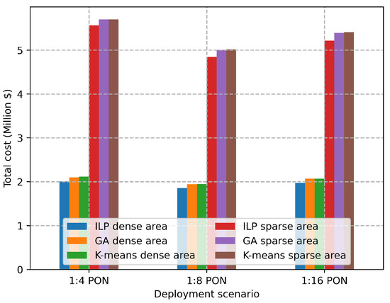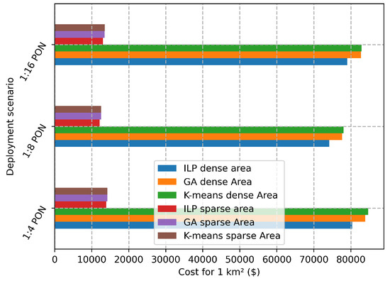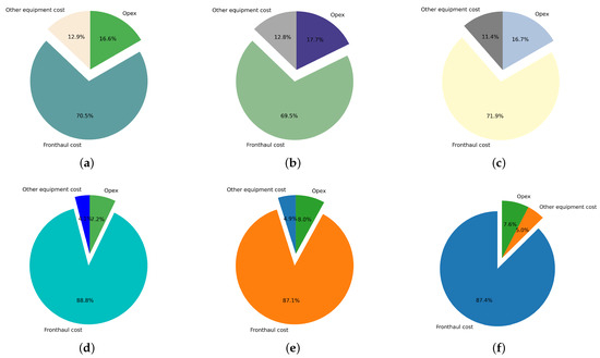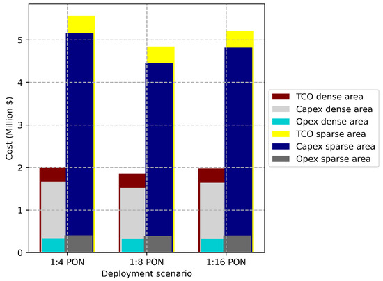 Figure 8 shows the breakdown of the optimal total cost of the network in the sparse and dense deployment areas considering PON as a fronthaul with different splitting ratios (1:4, 1:8, and 1:16). We can observe that using 1:8 PON results in the most cost-efficient architecture. In the sparse area, using 1:8 PON can save up to 13% and 7.13% compared to 1:4 PON and 1:16 PON, respectively, while in the dense area, it can save up to 8% and 6.6% compared to 1:4 PON and 1:16 PON. In a sparse deployment scenario, the Capex reaches up to 93% of TCO, while in a dense scenario, up to 83.3% of the TCO. The reason is that the distances in the sparse area are larger than those in the dense area, which explains the higher costs in order to deploy longer distances of fiber cables. Figure 9 illustrates the optimal cost breakdowns in the dense and sparse deployment scenarios with different PONs. It is clear that the cost of the fronthaul is the most dominant one, due to the high investments needed for fiber deployment. Detailed cost values of Figure 9 are clarified in Table 7.