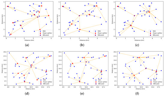 Optimal network deployment for studied areas for (a) 1:4 PON dense area, (b) 1:8 PON dense area, (c) 1:16 PON dense area, (d) 1:4 PON sparse area, (e) 1:18 PON sparse area, and (f) 1:16 PON sparse area.