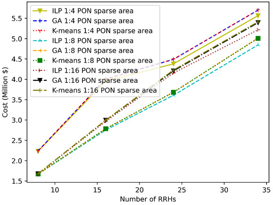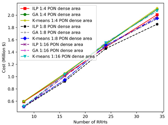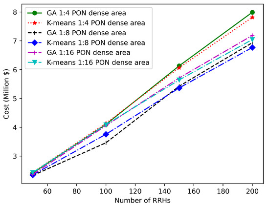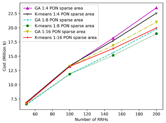 Figure 15 and Figure 16 illustrate the TCO that is needed for the sparse and dense areas, respectively, when the number of RRHs varies from 50 to 200 considering PON with different splitting ratios (1:4, 1:8, 1:16). All results in these figures are obtained by applying K-means and GA, where our ILP does not scale when the number of RRHs is higher than 34. We can observe that the GA is characterized by a better performance than the K-means for a number of RRHs less than 140, while K-means provides better results for a higher number of RRHs compared to GA (2.25% and 4.52% better performance for 200 RRHs in the dense and sparse areas, respectively).