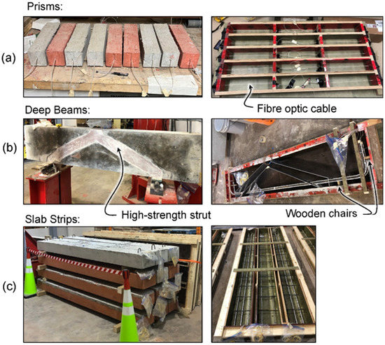 After casting, all specimens were cured under wet burlap for two days while in the forms. After being removed from their formwork, the specimens were cured in open air indoors as shown in Figure 1. Shrinkage strain measurements were taken using a Luna Technologies ODiSI 6104, which has an accuracy of 1 microstrain within the sensing core and a 2.6 mm gauge length [28]. Measurements were recorded at 1 Hz for 10 s. The strains were then averaged over those 10 s. The internal concrete temperatures were also recorded for the slabs and deep beams and the air temperature next to the concrete was recorded for the prisms. A temperature correction of 20 microstrain/°C was used for the reinforced specimens, which includes an 8 microstrain/°C temperature correction for the fibre [24] and a 12 microstrain/°C correction for the rebar [29]. For the unreinforced specimens, a temperature correction factor of 18 microstrain/°C was applied, which included an 8 microstrain/°C for the fibre and 10 microstrain/°C for the concrete [29]. Various researchers studying applications other than shrinkage have also confirmed the 8 microstrain/°C temperature correction for the analyzer and fibre optic cable combination. Barker et al. [30] confirmed the 8 microstrain/°C temperature correction for fibre optic cables bonded to rail and exposed to 40 °C temperature changes and Mehdi Mirzazadeh and Green [31] found the temperature correction of 8.7 microstrain/°C in a single mode fibre in RC beams under four-point bending and up to 30 °C temperature changes. Strain and temperature measurements in the current campaign were taken periodically until the specimens were tested to failure (those tests are not reported here).