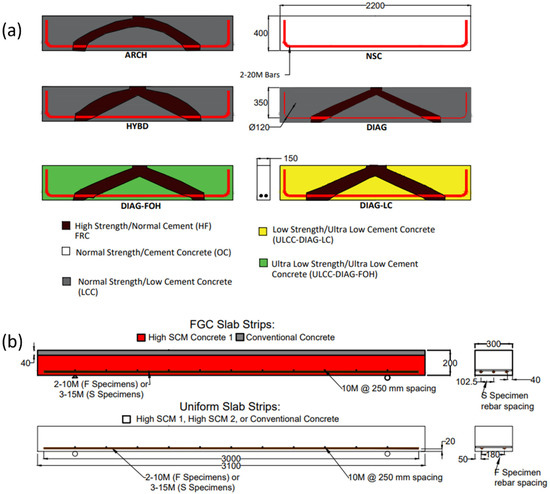 Specimen dimensions and functional grading—all dimensions in mm (a) Deep Beams, (b) Slabs.
