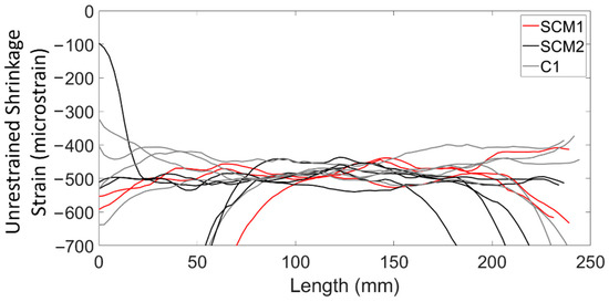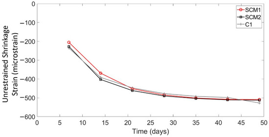 Each of the prisms had a predicted unrestrained shrinkage strain of 343 microstrain since nothing other than mix design differed amongst the specimens. Table 4 shows the shrinkage strain results for the prisms, which were similar in magnitude, however, SCM1, SCM2, and C1 had unrestrained shrinkage values that were 41%, 43%, and 39% greater than the ACI prediction. This difference is relatively typical for typical shrinkage measurements compared to models [42]. Al-Saleh [42] saw measured shrinkage strains of up to 174% greater than the ACI model at high temperatures, but typical differences at room temperature were about 50% compared to the ACI model.