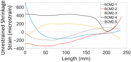 Unrestrained shrinkage strain of SCM2 prisms at an age of 2 days.