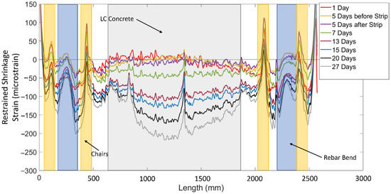 Figure 6 also shows the locations of the different types of concrete in the beam. The white sections from 500 to 600 mm and 1900 to 2000 mm are regions where the high strength concrete (HF) crosses the rebar, while the grey section is where the low cement concrete (LC) crosses the rebar. The region from 500 to 2000 mm will be the main focus of the restrained shrinkage discussion as it is free from the effects of the rebar bends and wooden chairs.