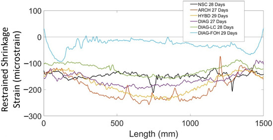 To better understand how the distribution of shrinkage strains varied amongst the test beams with varying geometry (shown in Figure 2a), Figure 7 shows the strain distributions (over the middle 1500 mm region between the wooden chairs) for all beam specimens at or within one day of 28 days. The strain measurements were adjusted to account for temperature as well as localized bar bending by averaging the strain measurements on two sides of the same bar, as described by Davis et al. [24]. The results in Figure 7 show large variations in the shrinkage strain distributions within each beam, which is attributed to the concrete mix, and more specifically the amount of cement in the mix. Past work by Bentz and Snyder [39] has shown that cement content is a primary factor that influences shrinkage behaviour of concrete. The NSC specimen, which was made of Ordinary Portland Cement concrete (OC) had an approximately uniform shrinkage strain distribution of −148 microstrain on average. The local peaks in the strain distribution could be attributed to the coarse aggregate in the concrete contacting the fibre optic cable or air pockets, causing a local strain disturbance. Beams DIAG, ARCH, and HYBD were all fabricated of concrete with the same mix designs and distribution of concrete at the rebar location: the outer 100 mm on each end of each FGC specimen was high strength (HF) concrete, and the inner 1300 mm was low cement (LC) concrete. The results show that these specimens exhibited similar magnitude and distribution of shrinkage strains, which had a distinct curved distribution. Finally, beams DIAG-FOH and DIAG-LC were both fabricated of ultra low cement concrete (ULCC), which had a much lower cement content, and the results show that both of these specimens had much smaller shrinkage strains.