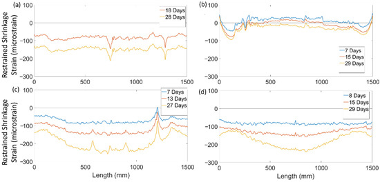 Figure 8 shows the evolution of the shrinkage strain distribution over time for NSC, DIAG-FOH, ARCH, and HYBD. The results show that local peaks in the strain distributions were present in the initial readings after early-stage shrinkage and persisted in subsequent strain measurements. The strain distribution for specimen NSC (Figure 8a) was approximately uniform and increased uniformly from 18 to 28 days and had an average shrinkage strain of −148 microstrain with a standard deviation of 12.8 microstrain. Specimen Diag-FOH (Figure 8b) also exhibited a relatively uniform shrinkage strain distribution, however, the magnitude of the shrinkage strains was very low and in some cases in tension, which is attributed the low cement content of the concrete. Exacerbating the effects of the low cement content was significant leakage of bleed water mixed with cement during concrete pouring which resulted in even lower cement contents, low water to cement ratios, and extremely low shrinkage of the concrete. In the remaining FGC beam specimens (ARCH and HYBD in Figure 8c,d), the results show that while the shrinkage strain distribution was initially uniform (at 7 and 8 days), there was a non-uniform increase in shrinkage strains along the member length as a larger increase in strain was observed in the middle region of the specimen, creating a curved strain distribution. Because the strain distribution was time dependent, this behaviour is attributed to the fact that these beams were functionally graded and that the different concretes used within the member experienced different time-dependent shrinkage behaviours leading to non-uniform shrinkage strain distributions along the beam length. In particular, the presence of an embedded strut (shown in Figure 2) had a tendency to prevent shrinkage near supports while the middle of the beam experienced higher shrinkage, leading to the nonlinear shrinkage strain distributions observed in Figure 8.