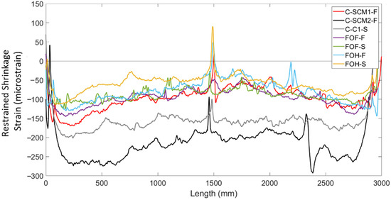 The results in Figure 9 shows that for the normal concrete control (C-C1-S), the shrinkage strain distribution was approximately uniform along the length of the bar, with an average shrinkage strain of −157 micrsostrain and a standard deviation of 15.0 micrsostrain. The results also show that all the specimens that had bars surrounded by high SCM concrete (FOF-F, FOF-S, FOH-F, FOH-S, C-SCM1-F, and C-SCM2-F), the shrinkage strain distribution was nonlinear and upward curving, opposite to those observed in the deep beam specimens. Furthermore, the bars that were surrounded by SCM1 concrete all had similar strain distributions and comparable values of average shrinkage strain. This suggests the horizontal layering of the FGC specimens as well as the different rebar sizes (15 M for “S” specimens and 10 M for “F” specimens) had little effect on the restrained shrinkage behaviour of these specimens.