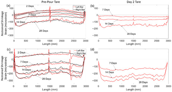 Figure 10 shows the development of strains for C-SCM1-F (Figure 10a,c) and C-SCM2-F (Figure 10b,d) for a tare prior to the pour and for a tare after day 2. The results show that the nonlinear distribution forms during the first 2 days of curing, and the strain distributions with a tare at day 2 are approximately uniform for both specimens. This suggests that the nonlinear strain distribution was once again caused by early-age shrinkage, including thermal and plastic shrinkage strains that initiate in the first two days, with the strain distributions remaining relatively locked in thereafter. This differs from the deep beam specimens in which the FGC beams nonlinear strain distribution developed over weeks instead of days. Furthermore, Figure 10a,c show that different bars in the same beam had similar strains, suggesting that the shrinkage strains remained relatively constant through the width of the beam.
