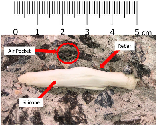 Figure 10c also shows a local strain peak and valley in specimen C-SCM2-F at 2400 mm, the shape of which somewhat resembles a trigonometric tangent curve. This localised strain behaviour has been previously found during testing of beam specimens by Poldoen et al. [15]. However, these had not been recorded during shrinkage strain measurements until this test. The results in Figure 10c show the progression of the distributed strain trigonometric tangent curve (DSTTC) in C-SCM2-F from day 2 to day 28. Figure 10d, which shows the day two tare of the same specimen, does not have a DSTTC. This indicates that the formation of the DSTTC occurred before day two, and the magnitude of the DSTTC did not change significantly over time. After the specimen was tested to failure (not described in this study), the concrete surrounding the region of the bar in the vicinity of the DSTTC was chipped away to look for a possible reason for why the DSTTC occurred in that region. An air pocket was found in the location of the DSTTC, shown in Figure 11, between two transverse ribs (~5 mm length). While an air pocket was associated with the DSTTC in this experimental campaign, the phenomena of the DSTTC as a general behaviour requires further research. This monitoring of this phenomenon, nevertheless, demonstrates the ability of DFOS to locate imperfections, such as air pockets, before loading occurs.
