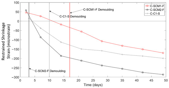 Another interesting parameter that can be investigated using the DFOS data collected in this study is the influence that stripping of the formwork had on the magnitude and distribution of the shrinkage strains along the slab strip specimens. FOF-F, FOF-S, FOH-F, FOH-S, and C-SCM1-F were demoulded three days after pouring, while specimens C-C1-S and C-SCM2-F were demoulded 10 days and 17 days after pouring, respectively. Figure 12 shows the second stage (tare at day two) restrained shrinkage averaged between 500 and 1000 mm for one bar in each of the three uniform specimens. The time of demoulding for each specimen is shown with a colour coded vertical line. The results show that following demoulding, there are rapid increases in the shrinkage strains. Furthermore, the earlier the demoulding, the larger increase in shrinkage strain at 28 days. This is attributed to the fact that stripping the formwork earlier exposes a larger surface of the concrete to drying for longer, compared to having a single face exposed to drying while in the forms. Time of demoulding has also been found by Samouh et al. [40] to play a role in the magnitude of shrinkage strains.