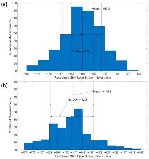 However, results in this study show that DFOS can provide valuable insights into the distribution of restrained shrinkage strains throughout RC members. In particular, results have shown that FGC members or those fabricated using SCM concrete have non-uniform shrinkage strain distributions that vary by over 100 microstrain along the length of the member. However, within ordinary concrete beams and slabs, that have reasonably uniform shrinkage strains, DFOS allows for measurement of shrinkage strains every 2.6 mm, which can be used to create a distribution of shrinkage strain, something that would not be possible with conventional discrete sensing methods. Figure 13 shows the distributions of shrinkage strains for the ordinary concrete members in this study. In both ordinary concrete specimens, while extreme strain variations exceeded 45 microstrain, the majority of measurements fall near the average, and the results show that the shrinkage strains are approximately normally distributed along the member length.