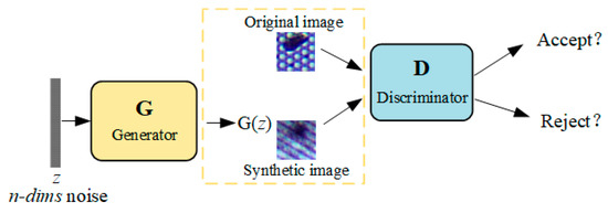 Data augmentation is widely used to avoid overfitting. Conventional data augmentation methods, such as flipping, rotation, and color space transformations, can only change the angle, position, or pixel value of the defects but not the shapes [6]. There may be significant limitations on defect detection, because models cannot recognize the defects in shapes not contained in training sets. A generative adversarial network (GAN) can address this problem by generating new samples based on the distribution of an existing dataset [7]. Ssu-Han Chen et al. [8] proposed a method for wafer die defect detection by combining a GAN and a modified you only look once version 3 (YOLOv3). The experiments showed that the GAN could enhance the diversity of defects, which improved the average precision by 7.33%. However, a traditional GAN may face a mode collapse problem (i.e., the image generated by the generator lacks diversity). Different GAN variants have been proposed to address this problem [9,10]. Wasserstein GAN (WGAN) [11] effectively avoided mode collapse by introducing Earth-Mover (EM) distance to define the loss function. Yawen Xiao et al. [12] proposed a deep learning-based WGAN approach to solve the imbalanced learning problem in cancer gene expression data. The results showed that, as compared with random oversampling, the synthetic minority oversampling technique, and GAN, the classifier with the proposed WGAN model provided better prediction performance in cancer diagnosis.