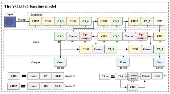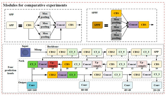 The backbone network included a Convolution-Batchnorm-SiLU module (CBS), C3_n, and spatial pyramid pooling (SPP). The CBS is the most basic module in a backbone network, consisting of a two-dimensional convolutional layer, two-dimensional batch normalization layer, and SiLU activation function. The CBS2, whose stride equaled 2, performed the downsampling operation. The bottleneck module was inspired by the idea of CSPNet [23]. Only half of the feature channels go through the CBS modules. SPP executes maximum pooling with kernel sizes 5 × 5, 9 × 9, and 13 × 13, and SPP concatenates the feature maps to avoid computing the convolutional features repeatedly.