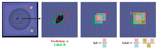 Three feature maps, with sizes of 20 × 20, 40 × 40, and 80 × 80, were used as three prediction layers to detect objects of different sizes. Every prediction layer outputs the corresponding prediction head, and finally works out the prediction bounding box and class. The generalized intersection-over-union (GIoU) [26] loss function can solve the problem of non-overlapping bounding boxes during training. As shown in Figure 5, box C is the minimum rectangle area including A and B. GIoU and the loss function were calculated by using Equation (11):