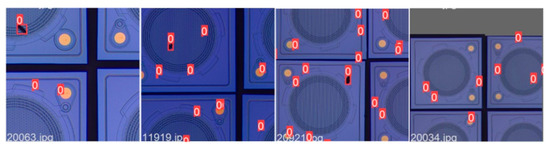 It can be seen from Table 4 that the detection mAP of the optimal model in this paper for MEMS surface defects is 0.901 and the F1 score is 0.856. Data augmentation and Mosaic greatly improve the accuracy of the detection model. In addition, one more prediction head added one more feature map, which performed better to detect MEMS defects. Some randomly selected detection results of the optimal model are shown in Figure 13, where the green is the label box and the red is the prediction box.