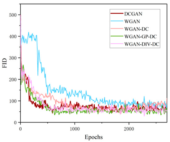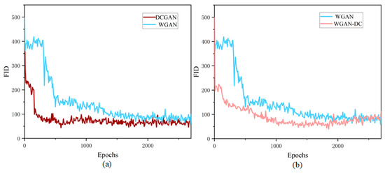 As shown in Figure 8a, the FID of DCGAN decreased rapidly in the early stage, and the fluctuation was small, indicating that the training of DCGAN was stable. The convergence of DCGAN training came at around 1000 epochs, and the lowest FID was 43.48. WGAN limited the parameters to [−0.01, 0.01] by clipping weights directly, which could easily lead to weight binarization and fall into a local extreme point. The FID of WGAN gradually converged at 1800 epochs, and the lowest FID was 54.47.