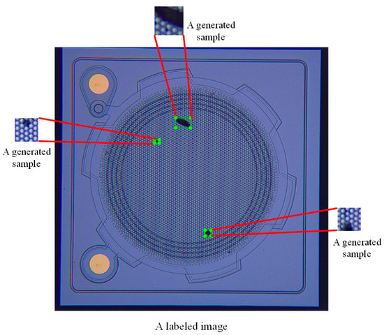 The improved model WGAN-DIV-DC was used to expand the MEMS dataset, and 15,000 defect samples were generated. Figure 10 shows some of the generated defect samples. The generated defects were randomly pasted in defect-free MEMS images, and the number of defects on each image ranged from one to five. Finally, the original 200 training images was expanded to 4000 images. One of the synthetic training images is shown in Figure 11.