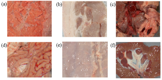 Sample images of organ tissues: (a) pig lung, (b) pork, (c) pig heart, (d) pig brain, (e) pig bag, and (f) pig kidney.