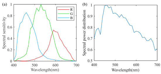 Similar to the imaging principle of human eyes, the responses of a three-channel camera depend on the Spectral Power Distribution (SPD) of the light source , the surface reflectance , the camera sensitivity functions , and the system noise . The camera responses can be written as the following imaging model, as shown in Equation (1).