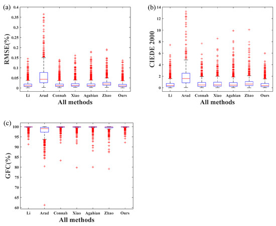 Boxplots of experiment results of (a) spectral RMSE error, (b) CIEDE2000 color difference, and (c) spectral GFC error.