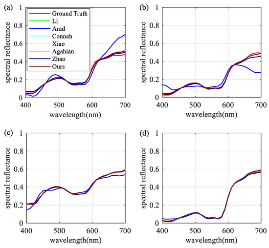 Comparison of spectral reflectance reconstruction results of four randomly selected samples: (a) No.76, (b) No.576, (c) No.708, and (d) No.816.