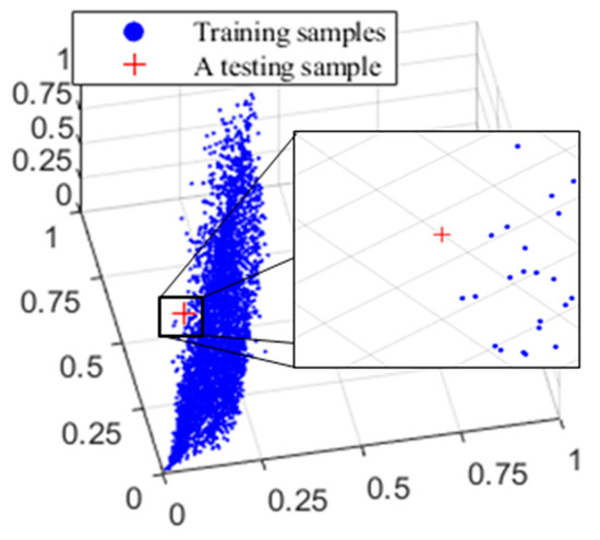 In addition, the reconstruction accuracy is impacted by the sample distribution. Due to the fact that the reflectance corresponding to each vertex was computed using regression on neighboring training sample points, the estimation was inaccurate for a test color situated in a location with a sparse distribution of training samples. This is inevitable for colors in the boundary regions, which is where the highest colorimetric error occurs, as shown in Table 1. As illustrated in Figure 9, the blue points represent the training samples, while the red “+” represents the test sample with the highest reconstructed color difference. Therefore, estimation is challenging since there are few training samples around the test data point.
