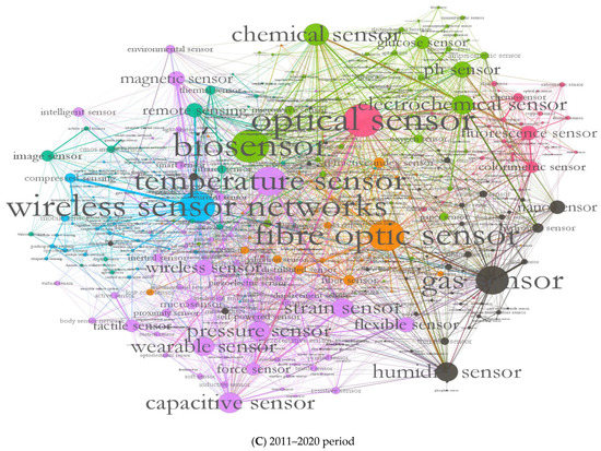 - Afterwards, we utilized Gephi software version 0.9.2 to visualize the matrix of co-occurrences and calculate the network measures [48]. The node indicates the words related to sensor research and technologies, and a link makes a connection between two words whenever they appeared in at least ten articles. To put it differently, a link means two different words co-occurred in at least ten articles. The color of nodes represents the community: when two nodes have a similar color, they are in the same community in the classification. The thickness of each edge represents the weight of co-occurrences. If more than two terms appeared in the same documents; the connected edge will be thicker.