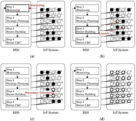 - Monitoring: Monitor the IoT system and check if the system is infected by any malicious botnet. Once detecting the malicious botnet, the BDS investigates it and collects the information such as its type and spread status.
