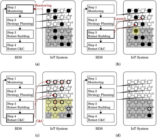 - Botnet Building: Build the white-hat botnet by sending white-hat worms [23] to the IoT systems according to the strategy.