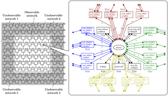- The “if” part: Assume is denoted by a sequence of nodes . Every node on has a white-hat bot except u. Let w and be, respectively, white-hat bots at n and . u is observable by w because u is adjacent to n. w is linked with from Property 1 because and have a white-hat bot. is observable by the BDS. Thus, from Property 2, u is observable by the BDS via the white-hat botnet.The “only if” part: Assume that there is a white-hat bot w by which u is observable. Let n be a node that has w. Since there is not any path between n and such that every node on the path has a white-hat bot, w is not linked with from Property 1. Therefore from Property 2, u is not observable by the BDS via the white-hat botnet. On the other hand, assume that there is no white-hat bot by which u is observable. The proof follows immediately from Property 2.