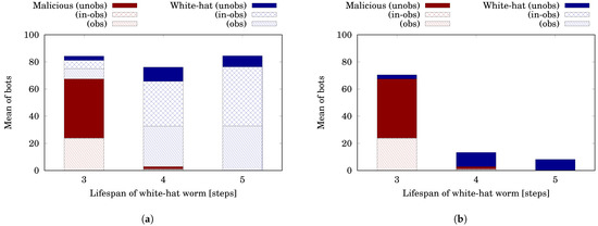 Assume each device reboots at 11 steps after infection. - When , the BDS adopts the Withdrawal strategy and commands the white-hat botnet to self-destruct. Let and , respectively, denote before and after sending the self-destruction order. Figure 9b shows an example of the state at .